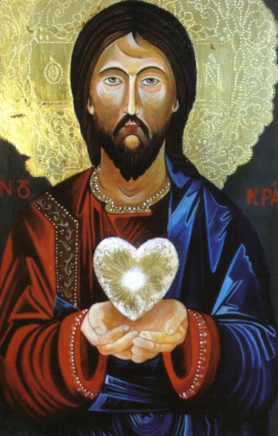 Este icono fue encargado a una mujer iconógrafa con las siguientes indicaciones. En lugar de un corazón poner la Eucaristía como una invitación a ser celebrada,comulgada y adorada. El color azul del manto expresa la humanidad de Jesús, cien por cien humano. La divinidad expresada con el color rojo habla del fuego de amor de su divinidad: “He venido a traer fuego al mundo y ojalá estuviera ya ardiendo.” (Lc.12,49)